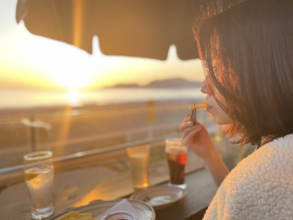 ちょうど夕焼けの時間帯だったので、近くのテラスでお酒を飲みながら日が暮れるのを待ちます。